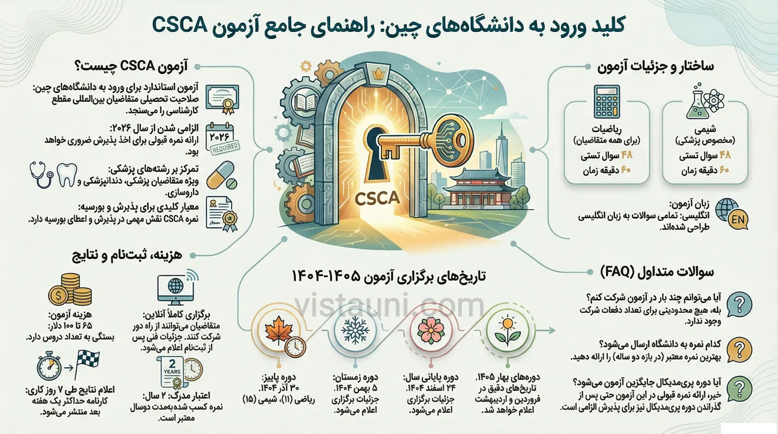 آزمون CSCA – China Scholastic Competency Assessment از سال تحصیلی ۲۰۲۶/۲۰۲۷ شرط اجباری پذیرش کارشناسی برای تمام دانشجویان بینالمللی در چین است. این آزمون توسط China Scholarship Council (CSC) برگزار میشود و سطح آمادگی تحصیلی دانشجو را در ریاضیات، زبان آکادمیک و دروس تخصصی مرتبط با رشته ارزیابی میکند. تمام اطلاعات مطابق نسخه رسمی ۲۰۲۵ است.