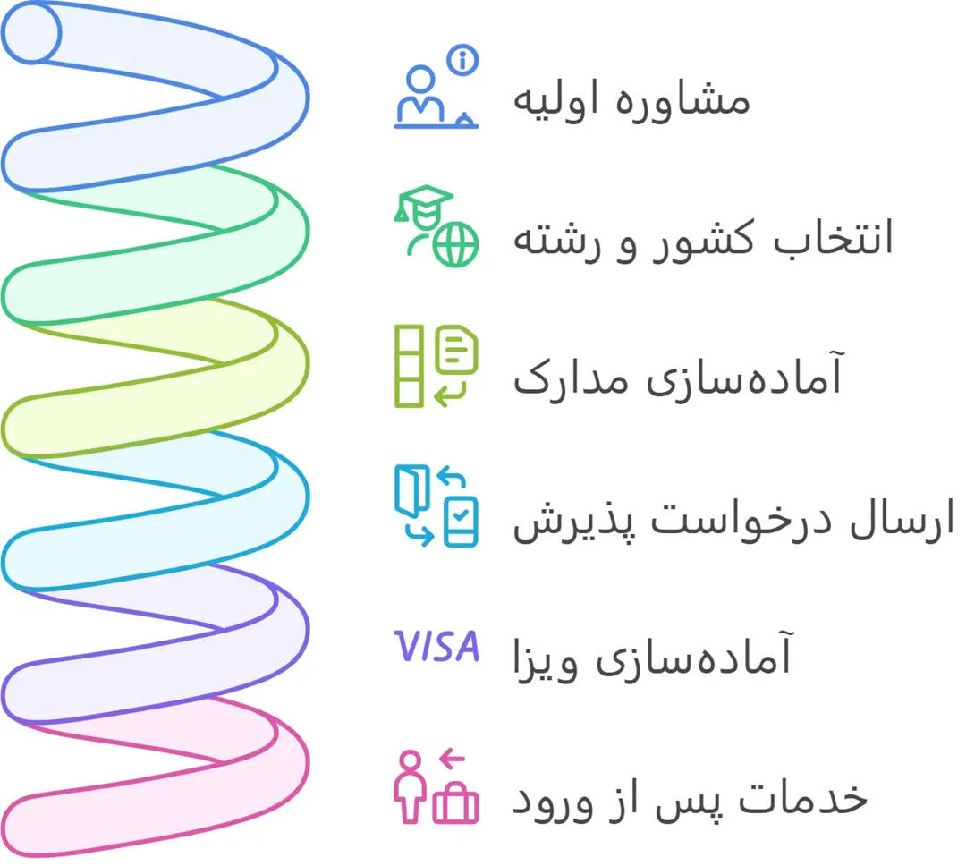 ما از اولین جلسه تا زمان ورود شما به کشور مقصد همراه شما هستیم. تمام مراحل شامل ارزیابی شرایط، آمادهسازی مدارک، ثبت درخواست پذیرش، پیگیری پرونده، آمادهسازی ویزا و خدمات پس از ورود با زمانبندی دقیق انجام میشود. شما در هیچ مرحله تنها نمیمانید و یک مشاور ثابت کنار شما میماند.