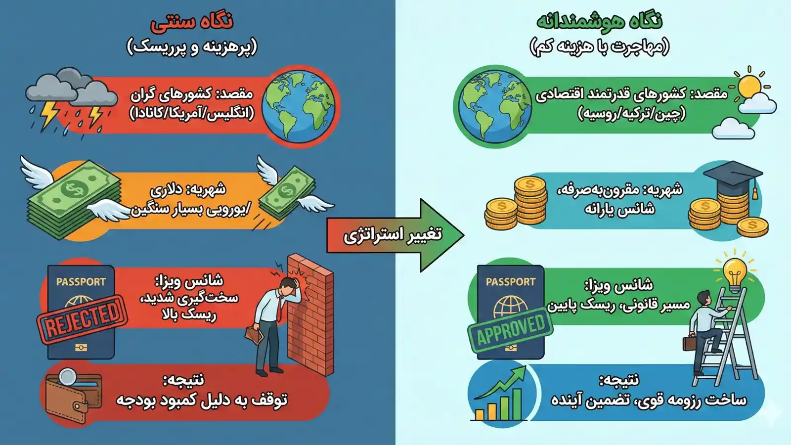 | معیار مقایسه | نگاه سنتی (پرهزینه و پرریسک) | نگاه هوشمندانه (مهاجرت با هزینه کم) |